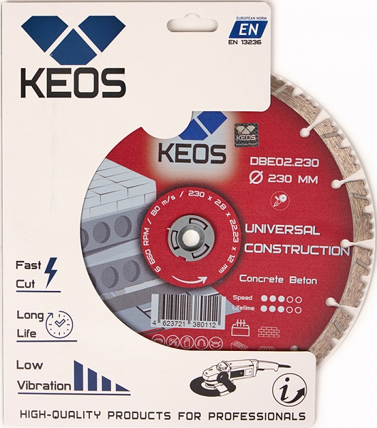 Диск алмазный сегментный Keos Universal Construction 230 мм (Кеос Универсал Констракшен 230 мм) предназначен для резки бетона, железобетона и кирпича на ушм (болгарках), штроборезах, бензорезах, электрических резчиках и плиткорезах, стенорезных машинах, как с подачей воды, так и всухую.